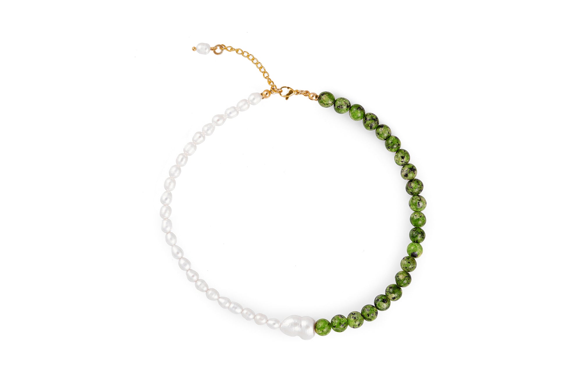 La unión entre el mar y la tierra. Las perlas que aportan esa calma, se entrelazan con el jaspe verde, piedra de equilibrio y conexión. Un diálogo entre lo fluido y lo firme, lo suave y lo salvaje.